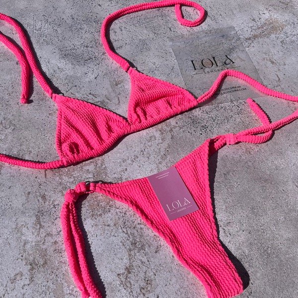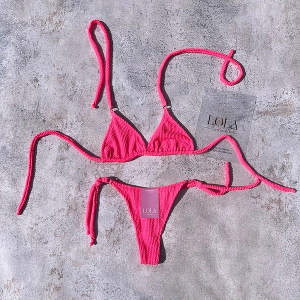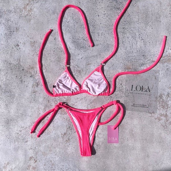 Corpiño triangulo movible, con apertura para tazas (no incluídas). Tiras largas, lo que permite diversas formas de atar.